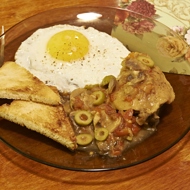 Serve the chicken stew on a plate, add the fried eggs, and the baguette.