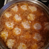 Pass the remaining onion, chicken, and soaked bread through a meat grinder, add the egg, salt, and pepper, and knead. Form balls with a spoon and drop them into the boiling soup, cook for 15 minutes, then add the noodles and ground pepper.