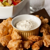 Coat the chicken pieces in flour and drop them into the oil. Fry for 3–5 minutes until golden brown. Do not overcook! Place on paper towels to remove excess fat.