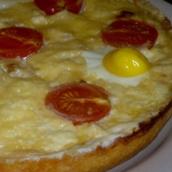Spread the chicken filling over the dough. Cut the cherry tomatoes in half and arrange them on the filling randomly, sprinkling with chopped basil. Mix the eggs with the sour cream, season to taste, and evenly pour this mixture over the filling. Place it in a preheated oven at 428°F for 15 minutes. Then reduce the temperature to 356°F, take out the pie, and randomly crack the quail eggs on top (do not bake the quail eggs for too long, as they become rubbery). Return to the oven for about 30–40 minutes, until the top of the pie and the edges are golden brown. Sprinkle the hot pie with a good pinch of paprika.