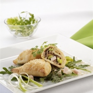 Place 1.5 tablespoons of the mixture on the chicken sheet. Form rolls and place them in a baking dish.