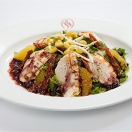 Sear the pre-prepared chicken breast fillet on both sides until fully cooked. Slice it at a 45-degree angle across into pieces 2–2.5 cm thick.