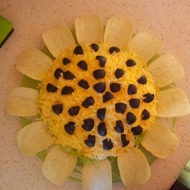 Before serving the salad, garnish the edges with chips and sprinkle crushed sunflower seeds in the center.