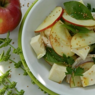 Wash the apples, cut them in half, remove the core, and slice thinly. Slice the pre-cooked chicken fillet in the same way, and crumble the cheese into small pieces with a fork.