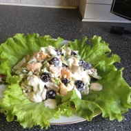For the sauce, mix mayonnaise, cream, and juice. You can sprinkle pine nuts on top.