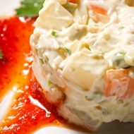Combine all the ingredients, add the green peas, and dress the salad with the sauce.