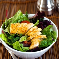 Preheat the grill or barbecue. Brush the chicken breasts with vegetable oil, lightly salt and pepper them, and place them on the grill. Cook for a few minutes until done and golden brown. Cool and cut into small pieces.