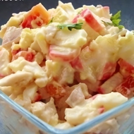Dice the tomato, bell pepper, chicken fillet, and eggs. Add salt, pepper, and mayonnaise.