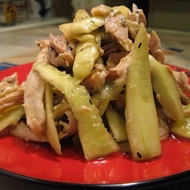 Boil the chicken meat and shred it into long fibers. Add to the cucumbers.