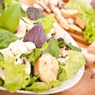 Chicken thighs can be replaced with chicken fillet or turkey meat. Dress the salad just before serving. Sour cream can be used instead of mayonnaise.