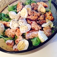 Add the cooked chicken fillet to the salad. Cut the quail eggs in half and add them to the salad bowl as well. Add basil, tarragon, wine vinegar, olive oil, season with salt and pepper, then mix well.