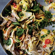 Once the chicken has cooled slightly, tear it into fairly large pieces by hand. Place it in a large bowl, drizzle with half of the orange paste, and mix thoroughly. Add the remaining ingredients, including olive oil. Gently toss to combine. Taste and, if necessary, add salt and pepper, along with a bit more olive oil and lemon juice.