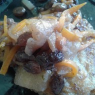 Once the vegetables are sautéed, place the chicken pieces on top, starting with the thickest ones. Layer the pears and raisins on top. Pour in the wine. Sprinkle a small amount of lemon zest on top. Keep on the heat for a little while and serve.