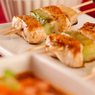 Preheat the grill or barbecue. Grill the chicken skewers for about 8 minutes until cooked through. Transfer to a plate, cover with foil, and let rest for a while.