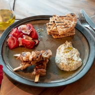 At a popular Greek restaurant in Moscow, chicken souvlaki is prepared by marinating the chicken for a long time in olive oil with fragrant oregano, then grilling it and serving it with wheat pita, ripe tomatoes, and a side of tzatziki.