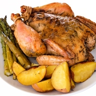 Sew up the opening, brush the carcass with butter, wrap it in foil, and bake for 1.5 to 2 hours at 374°F.
