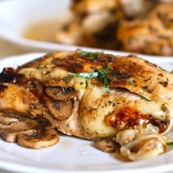 Secure the opening with a toothpick and place the chicken in a greased baking dish.
