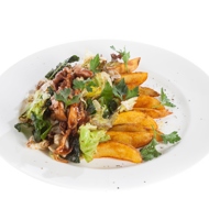 Place the mix on a plate, then add the potatoes and chicken on top, and garnish with parsley leaves.