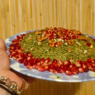 Garnish the salad with walnuts and pomegranate seeds on top.