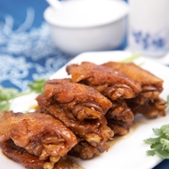 Marinate the chicken wings for 4 hours. To make the marinade, mix mustard, honey, soy sauce, and the zest of lemon and orange. Add crushed garlic.