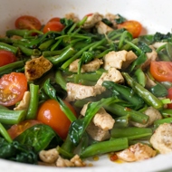 Add the green beans. You can use them frozen. Fry for another 3 minutes.