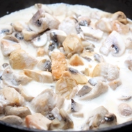 Once the chicken and mushrooms have simmered, drain off the excess liquid (leave a little depending on your preference) and pour in the cream. Let it cook on low heat for another 10 minutes.