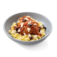 Arrange the chicken thighs on plates, drizzle with the tomato-olive sauce, sprinkle with crumbled feta, and serve alongside orzo pasta (following the package instructions).