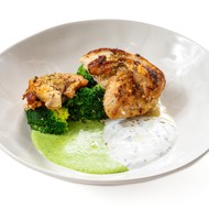 Transfer the chickens to a baking tray and place them in an oven preheated to 356°F for 20–25 minutes. Two minutes before they are done, add the broccoli to the tray to warm it up.