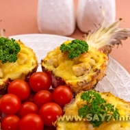 In one half of the pineapple, layer the chicken, then the pineapple flesh, followed by the cheese with garlic, finely chopped parsley, and top everything with sour cream.