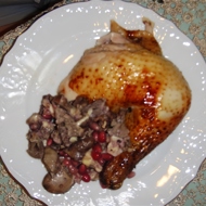 We season the chicken with salt and pepper, place it on a baking tray, and put it in the oven at a fairly high heat. Periodically, we take out the tray and drizzle the chicken with a spoonful of pomegranate juice and the fat that renders from the chicken, so it doesn't dry out. The pomegranate juice adds a tangy flavor.