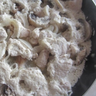 Soak the mushrooms in cold water for 8 hours. Afterward, drain the water, squeeze out the mushrooms, and chop them finely. Dice the onion and sauté it in vegetable oil until translucent. Add the mushrooms to the skillet with the onions and cook until the mushrooms are fully cooked.