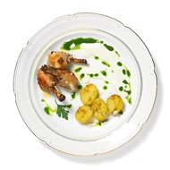 In a blender, combine sesame seeds, yogurt, parsley, the juice of one lemon, two cloves of garlic, and sesame oil. Season with salt and pepper, then blend until smooth to create a green sauce. Serve the chicken and potatoes with the sauce.