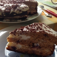 Blend the dates with milk in a blender, add to the eggs, then mix in the flour, fiber, and baking powder thoroughly. Add the pitted cherries and bake in the oven for 45 minutes at 180–374°F (I baked it in a slow cooker).