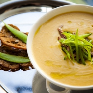 Season the soup with salt, pepper, and almond oil. Add the strips of snap peas and duck as a garnish.
