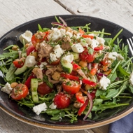 Whether it's a Niçoise, a Greek salad, or just that arugula dish, but not with shrimp — this salad evokes several iconic and beloved dishes. Packed with greens and onions, canned tuna and chickpeas, vegetables, feta cheese, and a dressing made of olive oil and lemon juice — it’s the Mediterranean easily transported to your plate any time of year.
