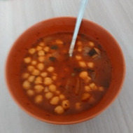 In two cups of the water in which the chickpeas are cooking, dissolve the tomato paste, then add the chickpeas and the water with the paste to the saucepan. Add the mint (finely chopped), pepper, and basil.