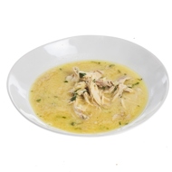 Add the chicken meat to the soup and strain the saffron infusion through a sieve before pouring it in.
