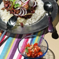 After two hours, add the canned beans and simmer for another half hour to an hour, then remove the pot from the heat, break the meat into pieces, and serve it with plain rice, a salad, for example, made of radishes, onions, and cilantro, along with sour cream, grated cheese, or tomatoes with onions. Alternatively, you can make do with what you have and even skip the rice.