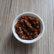 Mash the chilies and garlic with a pestle. Add a pinch of salt, a little fish sauce, and some of the water in which the dried peppers were soaked. Add water based on the desired thickness of the paste.