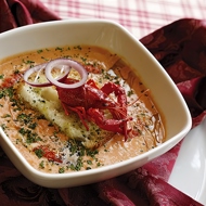 Peel the cucumbers, chop them into cubes, and soak them in kvass. Add cucumber brine, sour cream, chopped herbs, crawfish tails and claws, and eggs.