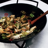 Add the chopped green peas and sauté for thirty seconds, then add the shredded napa cabbage and sauté for another minute.