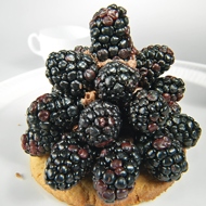 Place a dollop of chocolate-blackberry mousse, about one to two tablespoons, on each prepared round of dough. Surround it with blackberries from all sides to create a berry pyramid.