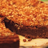 Cut a circle from the parchment paper the same diameter as your baking pan and place it at the bottom. Transfer the batter into the pan (23–28 cm in diameter) and bake for 25–30 minutes, until the cake is firm. Let it cool, dust with cocoa through a sieve, and sprinkle with praline.