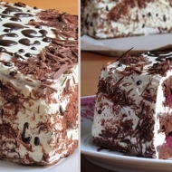 Assemble the cake. Cut the cooled cake in half, then slice each half horizontally, trimming the edges. You should have four layers. Spread the layers with cherry filling and cream, decorating to your taste and imagination.