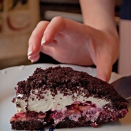 For the filling, slice the bananas lengthwise or into rounds. Place them at the bottom of the cake. Next, add the cherries (if they are frozen, let them drain first; I also squeezed them out a bit). Whip the cream with vanilla sugar and gelatin for the cream, or whip it, add regular gelatin, and let it set slightly. Then, spread the creamy soufflé over the fruits and cover it with crumbs from our chocolate batter.
