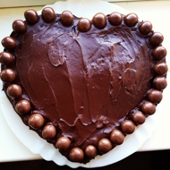 Spread 1/3 of the chocolate glaze between the cake layers, and use the remaining part on top, spreading it across the entire surface and sides of the cake. While the glaze is still soft, decorate the cake with chocolate candies like Maltesers.