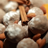 Dampen your hands with water, pinch off some of the mixture, hide an almond in the center, and roll it in the reserved coating. Place on a plate or board and hide in the refrigerator for 30 minutes. Sprinkle with powdered sugar on top.