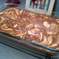 Line a springform pan with parchment paper and layer the white and chocolate mixtures alternately in the center of the pan, following the Zebra cake principle, until the pan is filled. You can create a marbled pattern with a knife or stick.