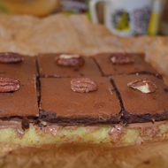 Bake in the same manner separately from the first layer. Let cool in the same way. Five minutes before it's done, top with pecans.