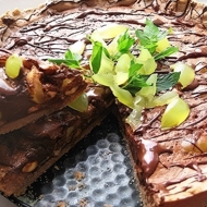 Drizzle the finished chocolate nut cake with melted chocolate, and decorate with grapes and a sprig of mint.